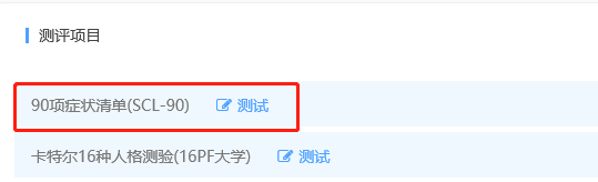 點擊“心理測評”圖標后,可看到參與測試的量表“90項癥狀清單”;點擊量表名稱后面的“鉛筆“圖標,即可開始測試,如下圖: