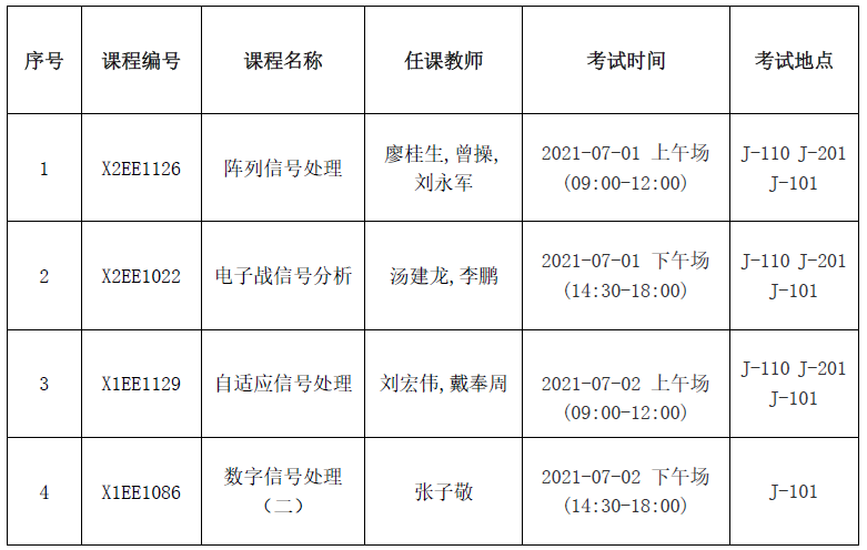 【考試通知】電子工程學院2021春季部分學位課考試通知 2021-06-21 19:07:00 瀏覽次數: 注意:考試時長以卷面為準,考試方式為閉卷,請各位同學注意考試時間和考場安排,不要走錯教室,提前進入考場就坐,相互通知,具體考試名單及安排見附件。 附件1:2021春季《陣列信號處理》考試名單 附件2:2021春季《電子戰信號分析》考試名單 附件3:2021春季《自適應信號處理》考試名單 附件4:2021春季《數字信號處理(二)》考試名單 電子工程學院 2021年6月21日 責任編輯:鄧鑒 上一篇文章:電子工程學院2021年博士研究生擬錄取考生組織關系轉接等補充通知 下一篇文章:電子工程學院2021年碩士研究生擬錄取考生黨團組織關系轉接補充通知(6.17日更新)