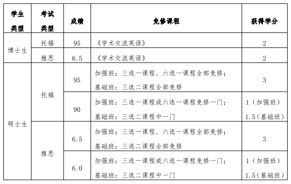 對全體研究生的英語教學進行改革,除參加學校統一開設的英語課程獲得學分外,可以通過 參加托福或者雅思考試達到相應分數來獲得學分。擬參加托福/雅思考試的學生,可憑借考 試成績,辦理相關英語公共課課程免修與學分認定,成績與學分轉換如下表: