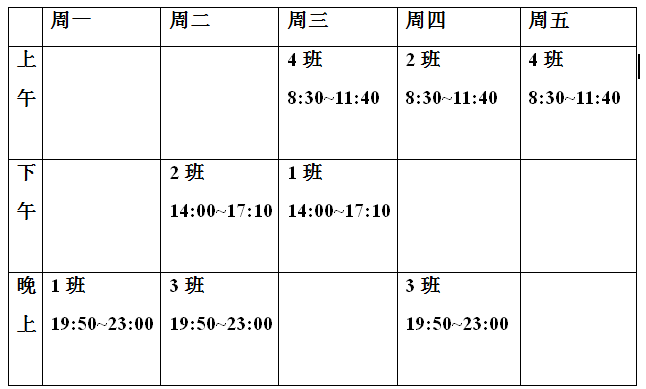 每個班每周上2次課,每次課4課時,總共4周半,時間安排如下表。首次課為理論課,只上2課時。