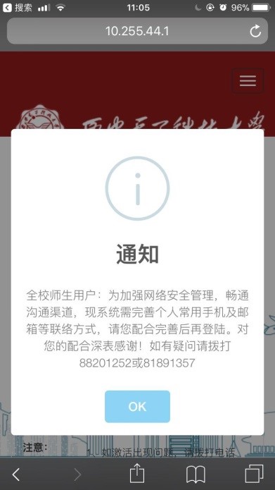 北校區碩士研究生關于無線登錄頁面激活賬號的通知 2017-11-06 16:06:00 瀏覽次數: 全體碩士研究生: 為加強個人賬戶安全管理,暢通溝通渠道,現系統需完善個人常用手機號及郵箱等聯絡方式,請您配合完善后再登陸。激活過程中如有疑問請撥打88201252或88201650 激活方式: 1.筆記本電腦或手機連接stu-wlan,彈出如下圖所示頁面(如果未自動彈出,請在瀏覽器輸入10.255.44.33) 2.輸入用戶名密碼,點擊登錄。彈出如下所示頁面,按提示操作即可 3.彈出如下界面,說明激活成功,激活成功后重新輸入用戶名密碼即可成功登錄。 上一篇文章:關于做好2016~2017學年研究生評優工作的通知 下一篇文章:2017年度天線與微波技術重點實驗室學術年會征稿啟事