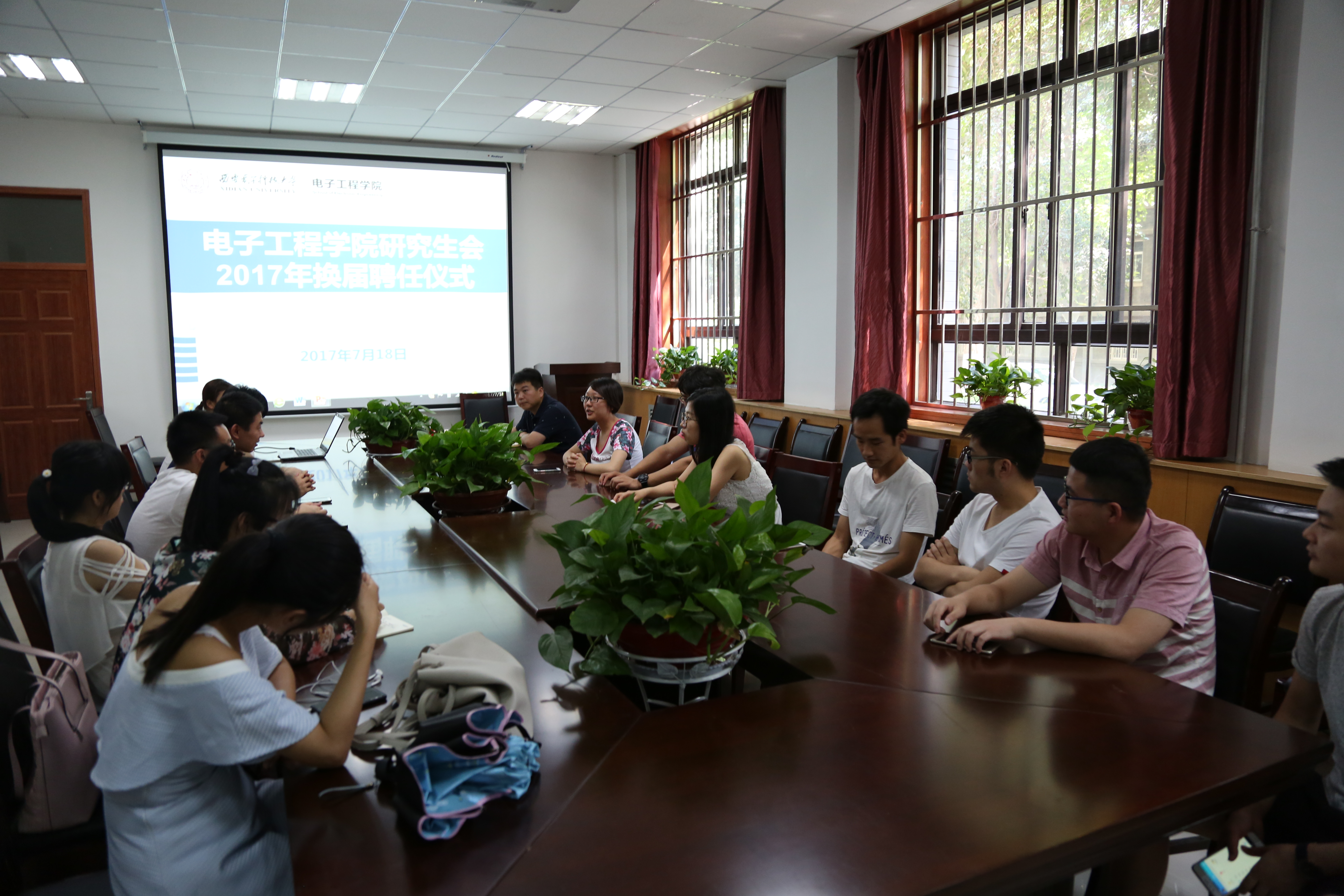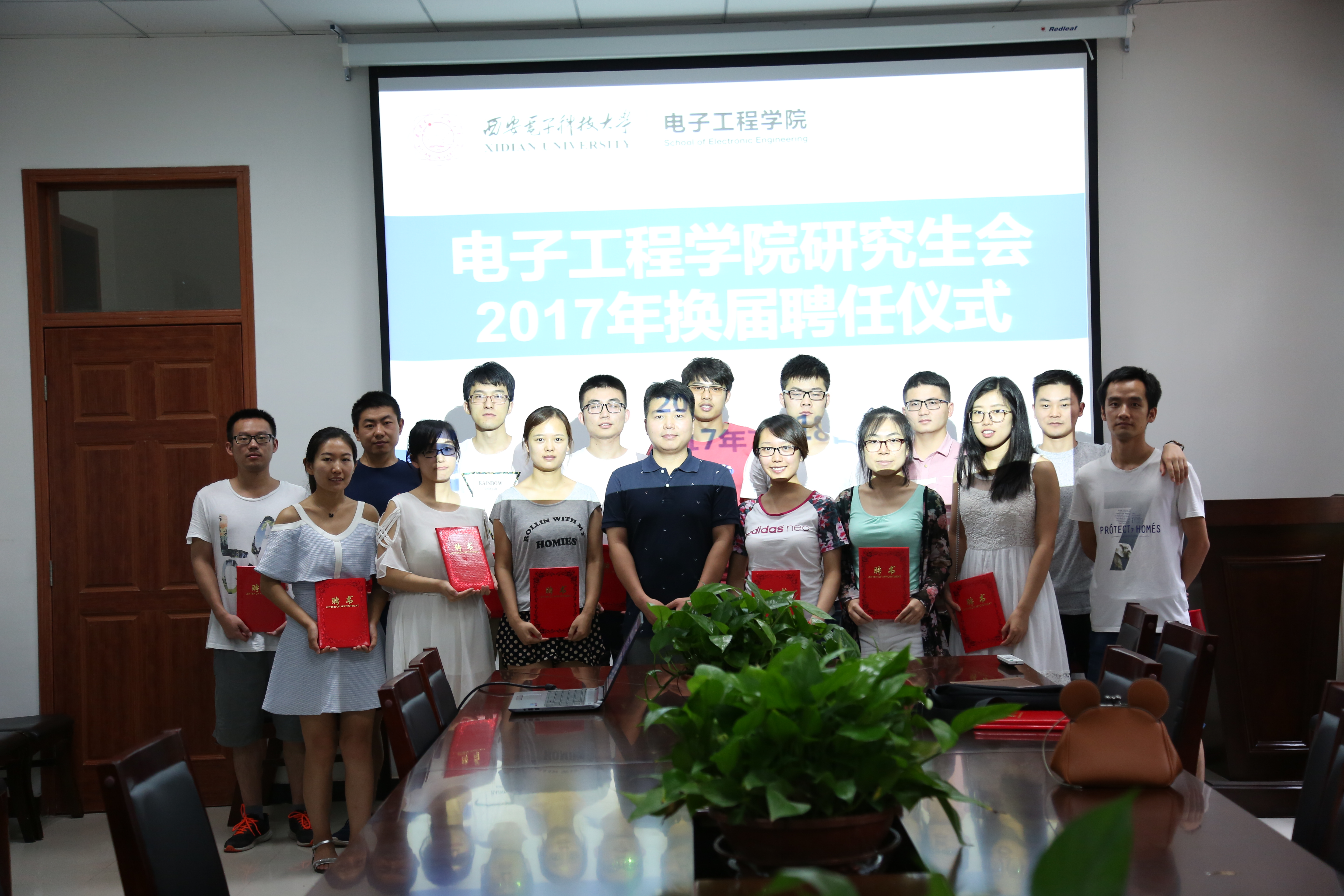 (通訊員:侯敏)7月18日下午,在西大樓Ⅲ區109會議室,電子工程學院研究生會舉行了2017年換屆聘任儀式。電子工程學院研究生輔導員鄧鑒老師、電子工程學院研究生會主席張寶譽以及研究生會的同學參加了本次聘任儀式。