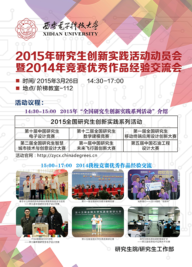 為提升研究生創新實踐能力,推動研究生培養模式改革,學校決定組織廣大研究生參加由教育部學位與研究生教育發展中心、中國科協青少年科技中心發起的2015年“全國研究生創新實踐系列活動”。作為系列活動的啟動儀式,研究生院決定于3月26日下午2點30分于北校區階梯教室112召開“西安電子科技大學2015年研究生創新實踐活動動員會暨2014年競賽優秀作品經驗交流會”。屆時,將向大家介紹2015年研究生創新實踐活動六大賽事的具體情況,并由2014年度競賽獲獎優秀隊伍介紹參賽經驗。
