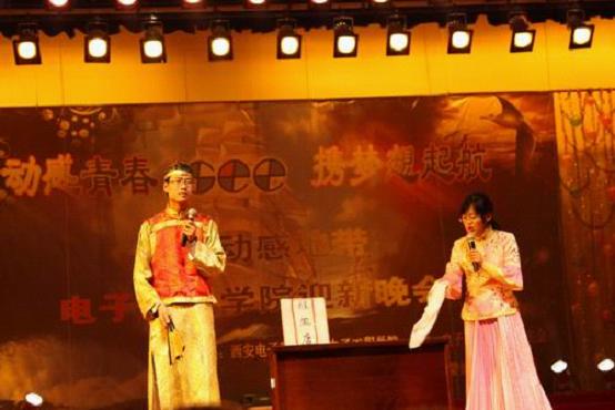 本次迎新晚會陣容強大,節目形式豐富多彩,節目內容異彩紛呈。伴隨著別具創意的倒計時,大幕緩緩拉開。活力四射的開場舞率先引爆全場激情,那青春洋溢的舞姿仿佛為10級新生的昨天畫上圓滿句點;接下來的雙簧以及女聲合唱帶領觀眾進入情境;話劇《西電愛情故事》詼諧逗趣,將晚會推向了第一個高潮,那幽默的語言、夸張的動作、貼近生活化的演出,將臺下的觀眾一次次逗得捧腹大笑。隨后舞蹈、歌曲串燒、三句半、音樂劇、黃梅戲輪番上演,令臺下的觀眾看得津津樂道,掌聲和歡呼聲一浪接著一浪。而輪滑表演者的高超技藝更是讓大家嘆為觀止、拍手叫絕,再次將晚會推向高潮。接下來的女聲合唱、樂隊表演均震撼著大家的視聽。合唱《你的微笑》朝氣蓬勃而又溫暖人心,他們派發的笑臉照片使人感到股股暖流涌上心頭。最后,晚會在教職工帶來的精彩舞蹈《祖國您好》中圓滿謝幕。