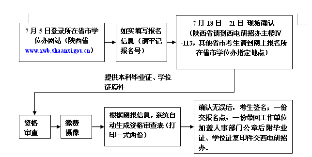2008年7月18日-21日到所在省學位辦指定的報名點交納報名考試費、考生圖像信息采集(照相)。陜西省的考生須到我校研究生招生辦公室(主樓Ⅳ—113房間)進行現場報名與攝像。報考人員需攜帶身份證原件及復印件、本科畢業證及學位證原件和復印件,并交納報名考試費。考生將報名現場打印的《報名資格審查表》交所在單位人事部門(或檔案管理部門),核準表中內容、填寫推薦意見,并在電子照片上加蓋公章,然后按要求將《報名資格審查表》并附畢業證、學位證復印件一份交西安電子科技大學研究生院研究生招生辦進行資格審查。如考生持境外學歷、學位報考,須經教育部留學服務中心認證,資格審查時須提交認證報告。