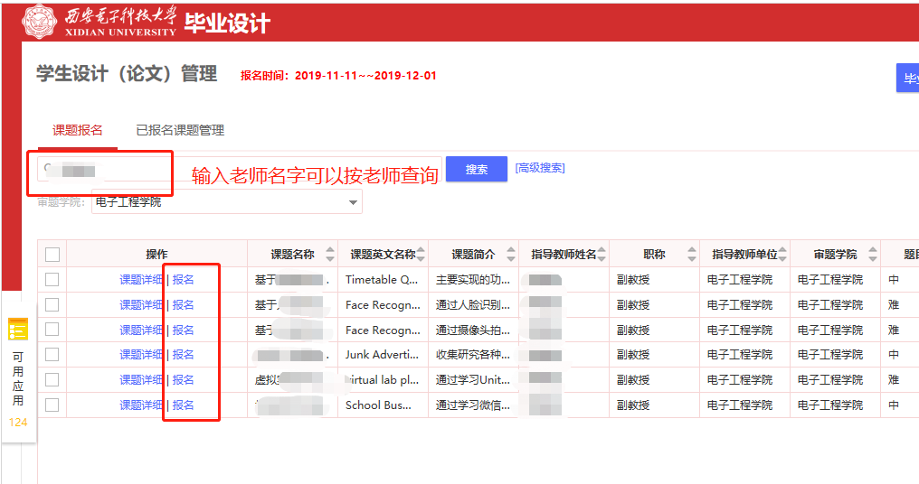 11月13日至11月23日,學生登錄學校一站式網上辦事大廳教務系統(http://ehall.xidian.edu.cn)畢業設計模塊(以下簡稱畢設系統)進行選題。