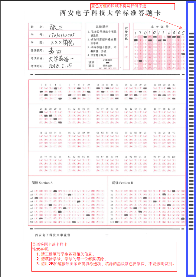 西電英語期末考試答題卡樣卡下載(含填寫注意事項) 2018-07-13 18:17:00 瀏覽次數: 各位同學:下周一進行大學英語2/4期末考試。為避免機器判卷讀卡時出現種種問題,現將答題卡填涂注意事項和樣卡發布出來,請各位同學認真閱讀,并注意考試時帶耳機考聽力。謝謝! 上一篇文章:關于開展西安電子科技大學首屆課堂教學創新大賽的通知 下一篇文章:關于開展2018年度示范性虛擬仿真實驗教學項目建設工作的通知