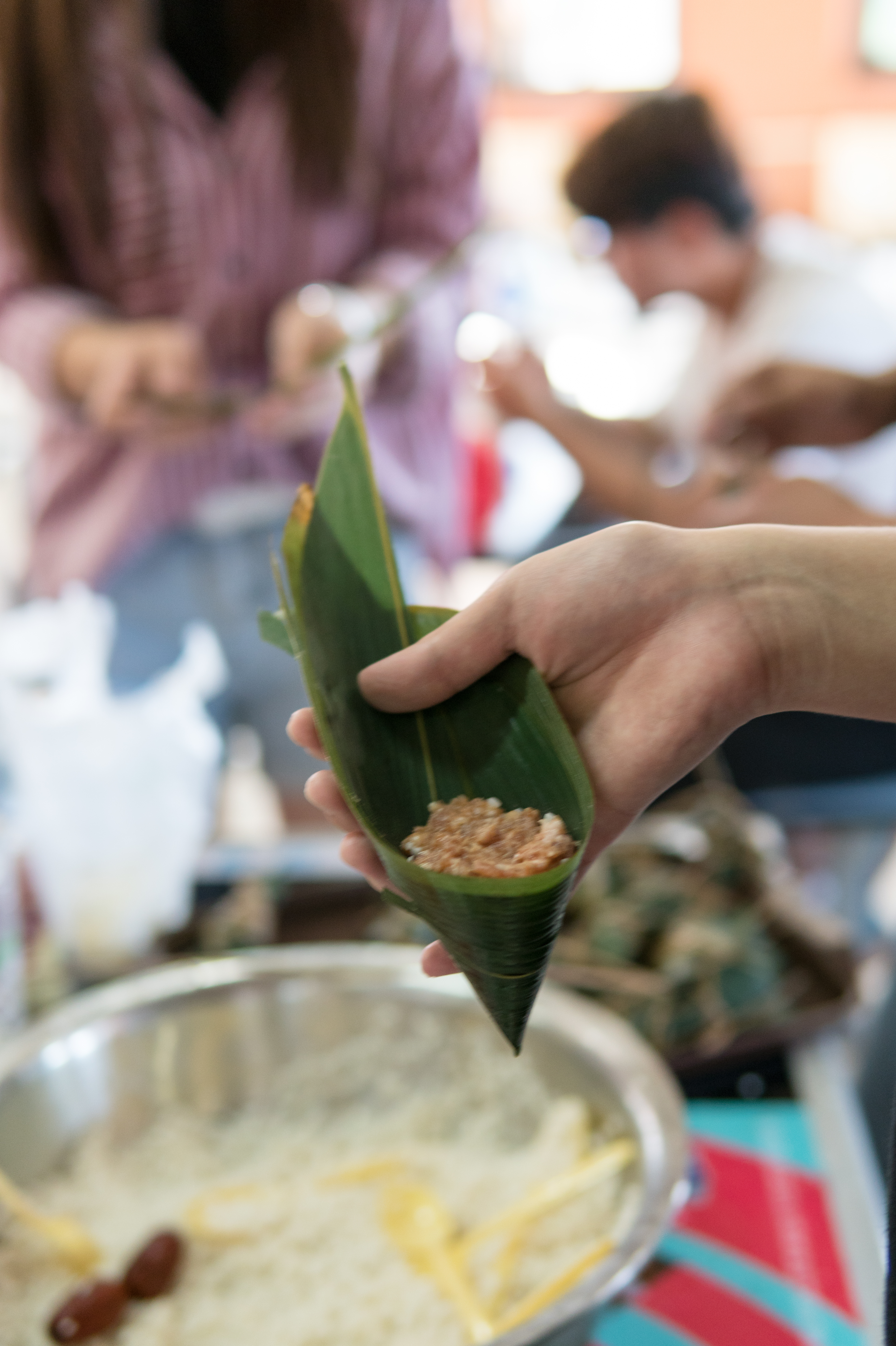 此次活動在海棠餐廳二樓舉行,學生到齊后整理粽葉、糯米、蜜棗、鮮肉等食材,從包粽子環節開始切身體驗端午文化。過程中學生們互相學習討論,餐廳的工作人員也給予了指導。在一次次嘗試后,學生們手法逐漸熟練,開始發揮創造,對傳統粽子的形狀進行改造。