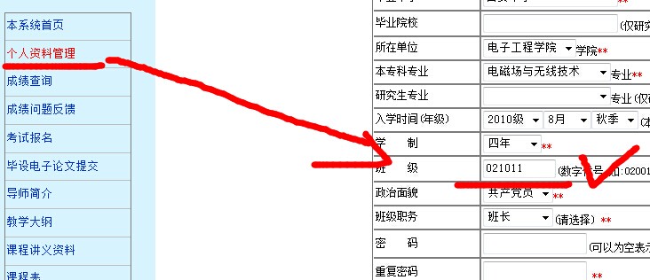 班級選擇錯誤,可以通過點擊“個人資料管理”,手動輸入正確的班級: