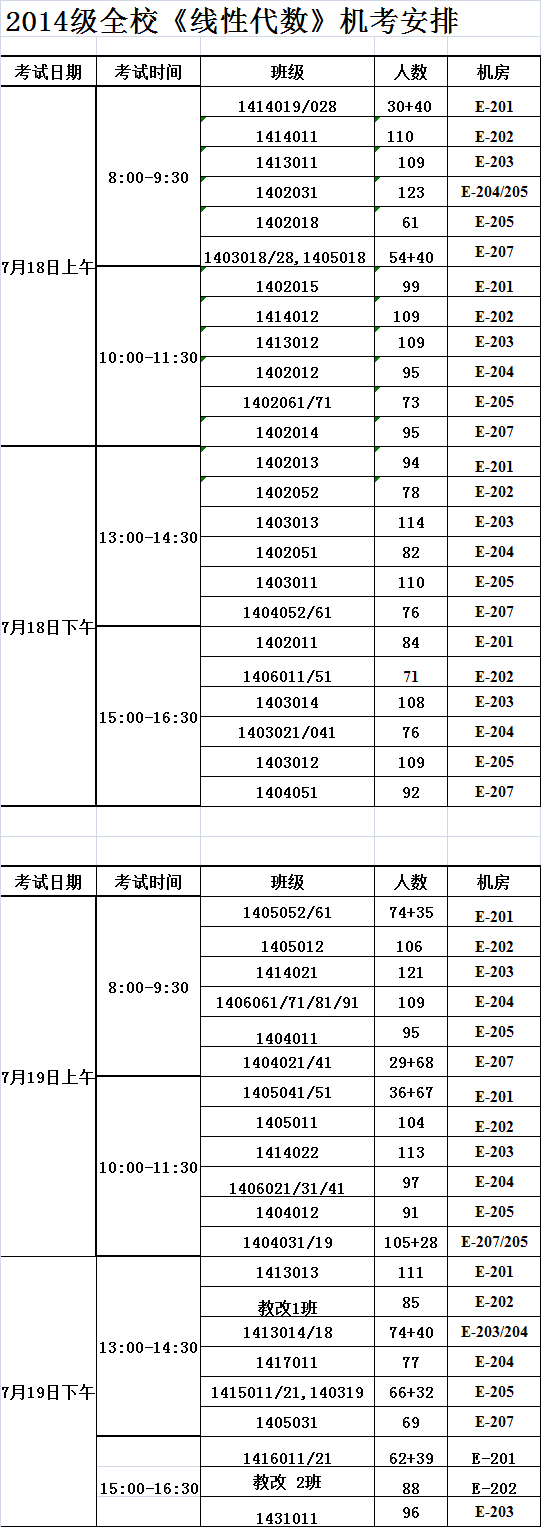 2014線性代數機考考場和時間安排 2015-07-16 20:32:00 瀏覽次數: 地點:計算中心機房 E3-201,202,203,204,205,207 機房 重要提示:線性代數筆試時間為90分鐘即 注: 1.各年級考試的學生,均須攜帶本人的一卡通,并擺放在座位左上角.無一卡通者不允許參加考試。 2.考試前學生務必認真閱讀機考須知。 3. 要求學生提前30分鐘到考場。 上一篇文章:電子信息工程專業在校生評價調查問卷 下一篇文章:電院2015年本科畢業設計電子論文提交系統開放