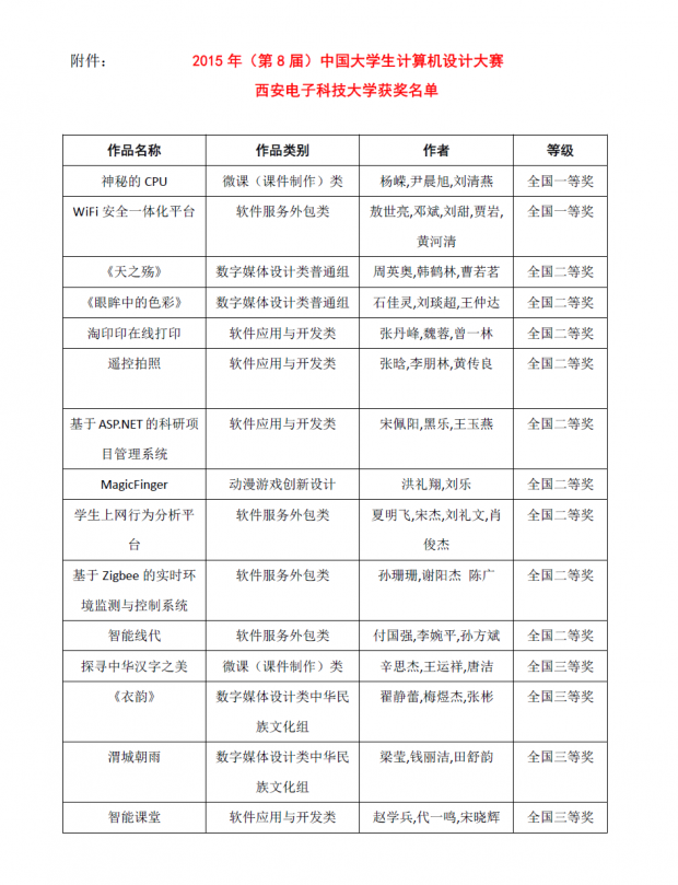西電新聞網訊(通訊員茍琳娜 胡曉娟)近日,從“2015年(第8屆)中國大學生計算機設計大賽”傳來捷報,西電學子經過激烈角逐,不負眾望,斬獲2項全國一等獎、9項全國二等獎、4項全國三等獎,并捧回競賽“優秀組織獎”。