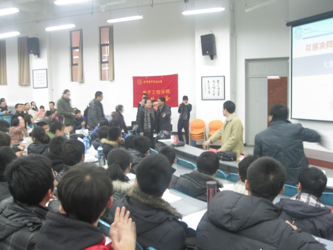 電院宣傳中心訊(通訊員 王佩瑤)在知識量大爆炸的今天,擁有綜合能力儼然成為個人發展、國家強大的必然趨勢。對于我們大學生來說,競賽則是培養綜合能力的大舞臺!2012年12月28日下午2:00到5:00,一場主題為“面向對象的科學研究及課外競賽的指導”的講座在D樓212教室成功舉辦。石光明、王新懷、孫肖子及孔東等老師蒞臨講座現場。
