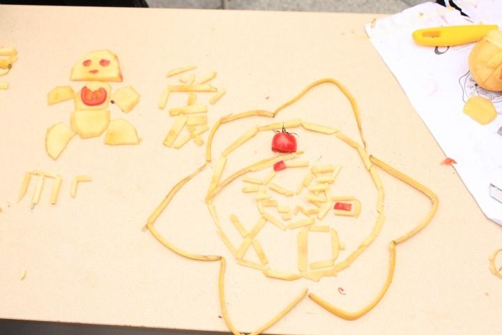 此部分的活動較娛樂,電院團委準備了三種標志,分別為西電八十周年校慶的80標志,西安電子科技大學的校徽,以及共青團團徽。參與的同學們明顯對于西電80周年校慶標志以及西電校徽興趣更為濃厚。活動開始后大家紛紛圍在桌前,小心的使用著刀具,用蘋果,香蕉,梨等水果拼成這兩個圖案,也有一些同學自己創造了標志與圖案,活動氛圍熱鬧非凡,大家用這種特殊的方式為校慶獻上自己的一份祝福。