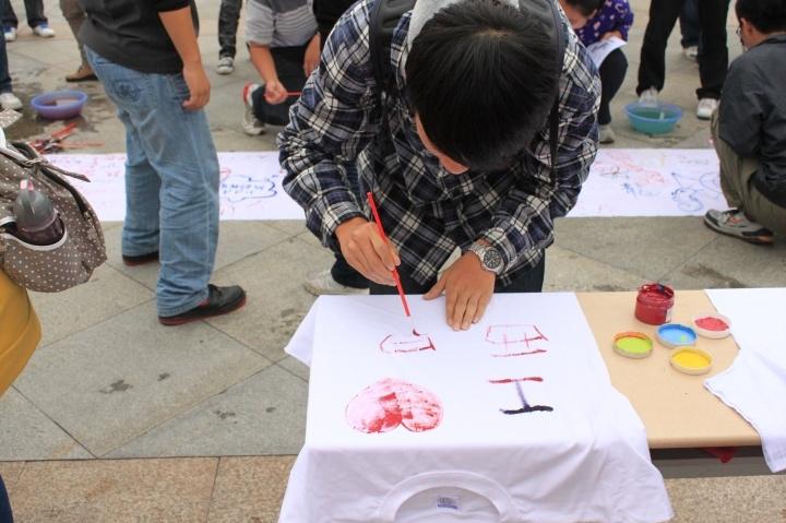 電院團委準備了兩條8米長的白布與30件長T恤以及各種顏料與畫筆,參與活動的同學在白色長布上寫自己想說的話、對母校的祝福、校徽等,也可以在白色T恤上自己設計圖案,他們將優秀作品保留了下來,每一個都合影留念。有的人在白布上寫“西電加油,校慶威武”,有的人寫的話簡單但有內涵“西電萬歲”,有的人設計的T恤衫上的內容也是用圖案畫出了“我愛西電”,所有的一切都將同學們對于母校的祝福大聲喊了出來!西電80周年校慶一定會圓滿成功!