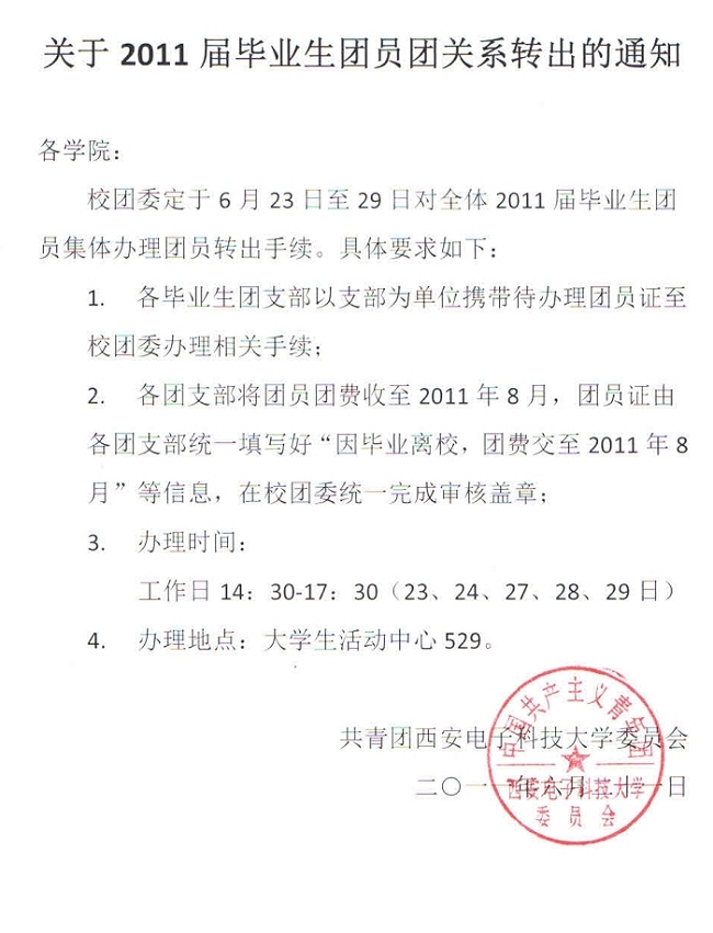 關于2011屆畢業生團員團關系轉出的通知 2011-06-27 10:58:00 瀏覽次數: http://news.xidian.edu.cn/view-29711.html 上一篇文章:電子工程學院關于2008級本科生生產實習的通知 下一篇文章:2011年意法半導體iNEMO校園創意大賽報名通知