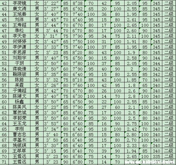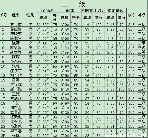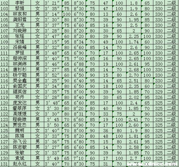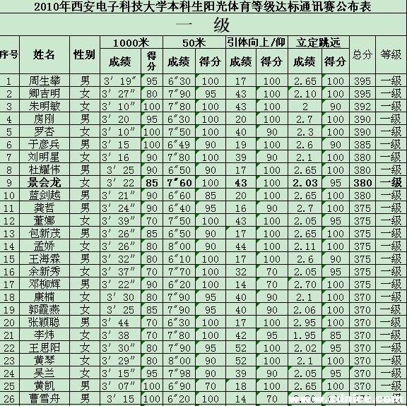 西電本科生陽光體育等級運動員達標賽成績 2010-05-14 20:38:00 瀏覽次數: 西電體育部在開展陽光體育活動中推出等級運動員達標賽,本科生中有42人達到一級,163人達到二級,220人達到三級,達標人數425名,占參賽人數的5%,在校運動會上頒發了證書,并且聽說達到等級者在評先、評優、評獎學金都有用。 研究生開課也要開展此活動,大家要爭取好成績,身體好才能學習好啊,祝大家健康快樂每一天! 來源:http://bbs.xdnice.com/thread-728981-1-1.html 上一篇文章:西安電子科技大學2010年度國家大學生創新性實驗計劃擬立項項目公示 下一篇文章:2010年“中興捧月”杯校園程序設計大賽