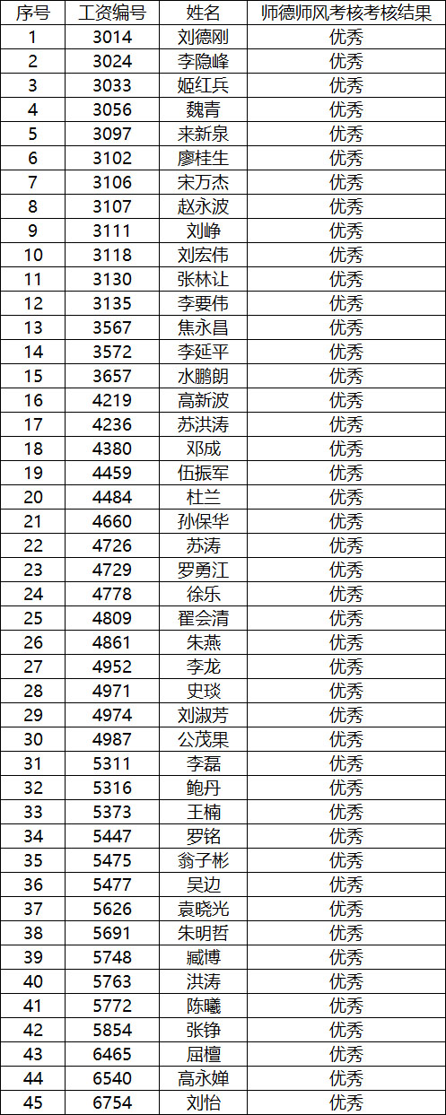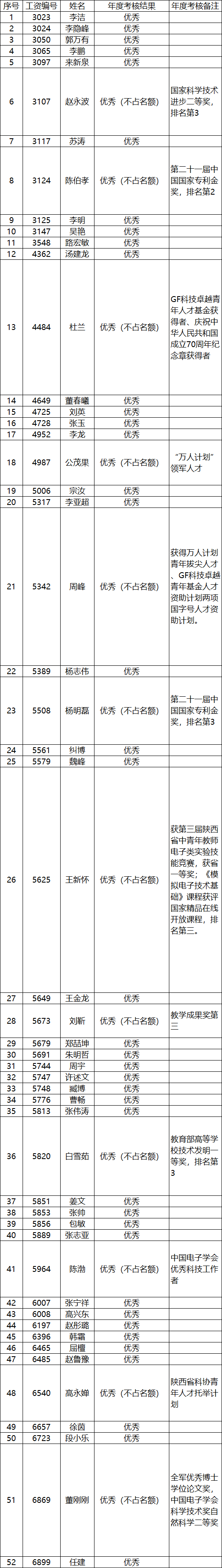 電子工程學院關于對2019年教師師德師風考核和教職工年度考核擬推薦優秀人員名單進行公示的通知 2019-12-15 00:10:00 瀏覽次數: 各位老師: 按學校相關要求,通過教師個人申請、系所推薦及黨政聯席會評審等環節,經研究決定,擬確定劉德剛等45人師德師風考核結果為優秀,李隱峰等52人年度考核結果為優秀,并進行公示。 公示時間:2019年12月13日—2019年12月15日 各位老師如有意見,可向學院進行反映或投訴。 電話: 88202276 88202253 具體名單如下: 電院2019師德師風考核優秀名單 電院2019年度考核優秀名單 電子工程學院 2019年12月13日 上一篇文章:關于開展2019~2020學年第二學期青年教師 助教工作的通知 下一篇文章:西安電子科技大學關于開展職員職級首次聘任的通知