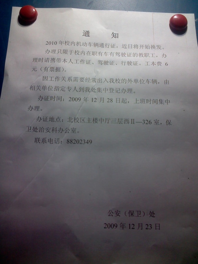 辦理2010年機動車校內通行證的通知