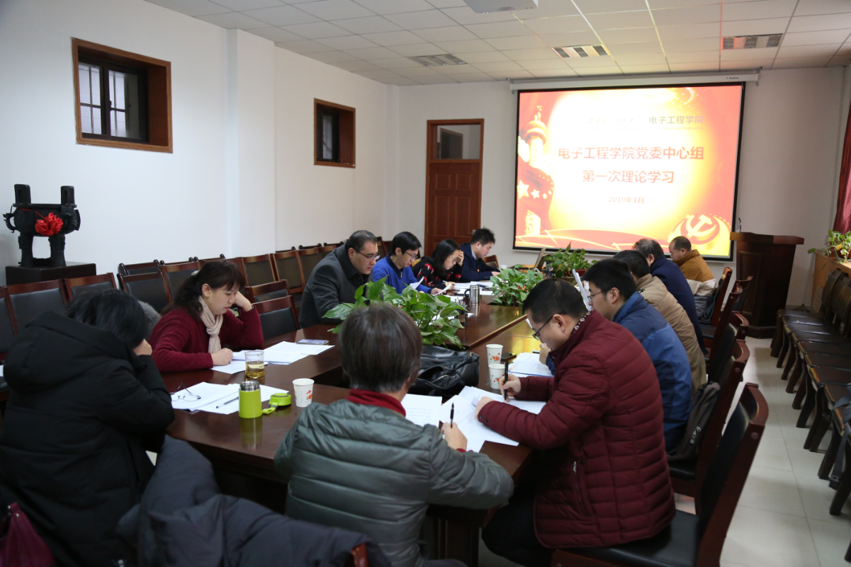 (通訊員劉昕雨)1月20日上午,在北校區西大樓3區109會議室電子工程學院黨委召開2019年第一次中心組學習(擴大)會議,學院兩委委員和教職工黨支部書記參加,學院黨委書記蔡固順主持。
