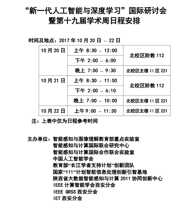 “新一代人工智能與深度學習”國際研討會 暨第十九屆學術周日程安排 2017-10-21 08:51:00 瀏覽次數: 上一篇文章:關于舉辦“第二屆電子信息青年學者論壇”的通知 下一篇文章:智能感知與圖像理解教育部重點實驗室師生參加第37屆IEEE國際地球科學與遙感大會