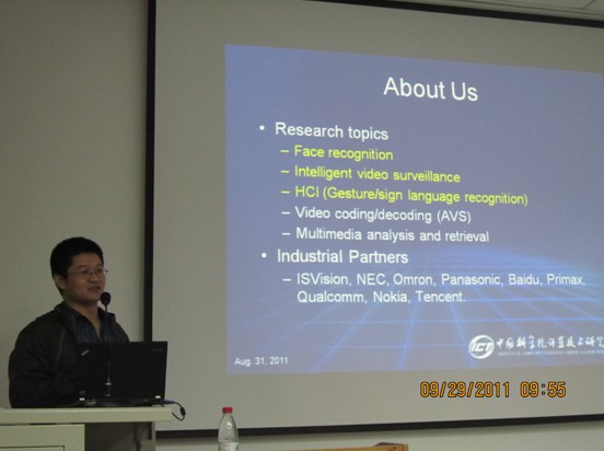 隨后,山世光研究員做了題為“Face Recognition:Quo Vadis?”的學術報告。山博士簡要介紹了他所從事學術領域的研究現狀及發展前景,重點為我們展示了他所在的研究小組的在人臉檢測、識別等方面的實時演示系統。