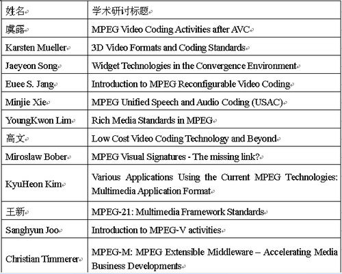 MPEG & JPEG會議是多媒體領域內的國際盛會,會后舉辦“多媒體技術發展與數字音、視頻標準化技術國際學術研討會”是每屆MPEG & JPEG會議的慣例。旨在總結、報告、宣傳和交流MPEG & JPEG會議期間涌現的多媒體新技術的應用和新標準。本次研討會組委會由美國南加利福尼亞大學(University of Southern California)的王新教授、JPEG主席Daniel Lee教授、瑞士聯邦工業大學教授,EMITALL Surveillance SA創始人IEEE Fellow Touradj Emrahimi博士、美國MERL實驗室IEEE fellow Huifang Sun博士以及MPEG中國主席北京大學IEEE Fellow高文教授等組成。特邀報告人包括來自美國南加利福尼亞大學(University of Southern California)的王新教授、北京大學的MPEG中國主席高文教授、德國Heinrich-Hertz-Institute (HHI) Berlin 的 Karsten Müller博士、浙江大學的虞露教授、韓國Samsung公司的Song Jaeyeon 博士、韓國漢陽大學的Euee S. Jang教授、美國華為電子的Minjie Xie博士、AHG 主席YoungKwon Lim博士、歐洲三菱電子的總經理Miroslaw Bober博士、韓國Kyung Hee大學KyuHeon Kim教授、ETRI高級工程師Sanghyun Joo和奧地利Klagenfurt大學的Christian Timmerer教授。各位專家發表的學術報告題目如下: