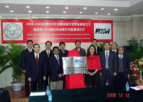 會談結束后,雙方舉行了“RIM無線通信研究獎學金”頒獎儀式和西電-RIM天線聯合研究中心揭牌儀式。儀式由高新波處長主持,在獎學金頒獎儀式上,段寶巖校長和RIM公司Adele Newton女士為獲獎學生頒發證書并分別致辭,勉勵學生努力學習,在今后的學習工作中取得更大的成績;通信工程學院博士生李靖作為獲獎學生代表也發表了獲獎感言并致謝。本年度,共有來自通信工程學院、電子工程學院和機電工程學院的10名博士生獲得RIM無線通訊研究獎學金。